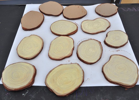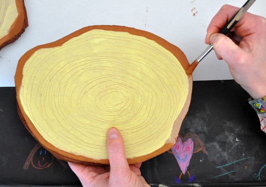 Using a wooden skewer, I etched imperfect circles in the wet paint to look like the tree growth rings.