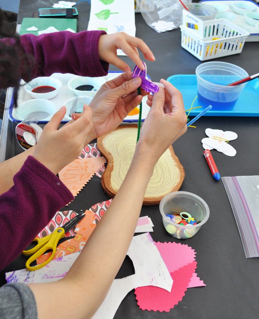 Last weekend several families joined us in The Studio for the family workshop “Butterflies and Caterpillars,” where we made a series of fun spring-themed projects. One activity that was a big hit with kids and parents was working together to make a paper butterfly garden. We provided an array of colorful paste papers, stamped construction papers, and other fun accessories like pom poms and sequins to turn into beautiful flowers, leaves and butterflies.