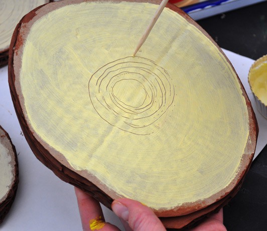 Once the stacks were dry (overnight), I used tempera paints to paint the sides brown and the tops pale yellow. I left a gap around the top of the stump to add detail later.