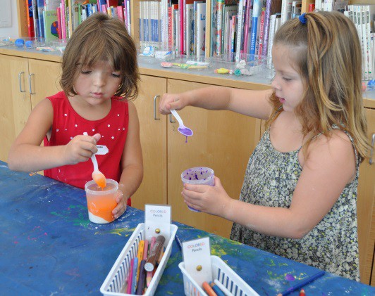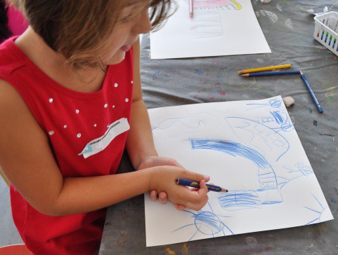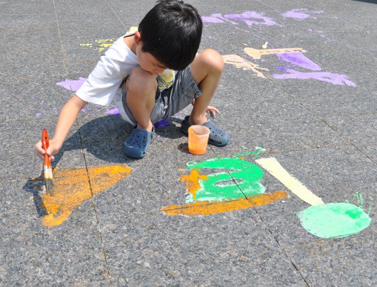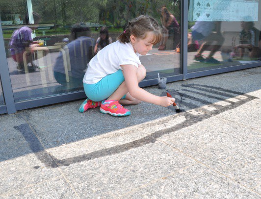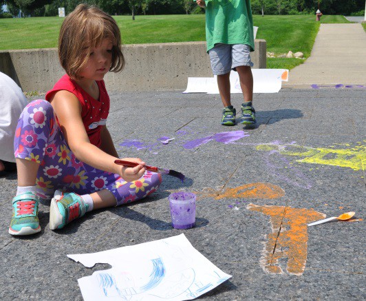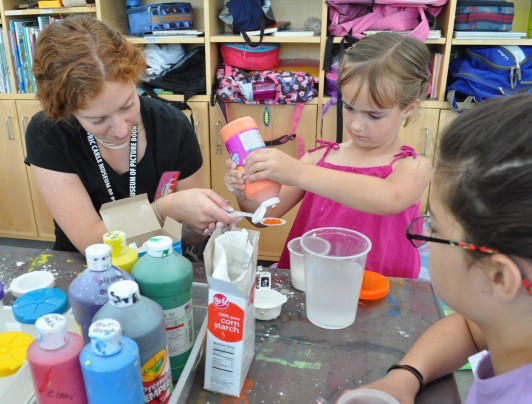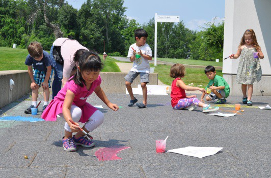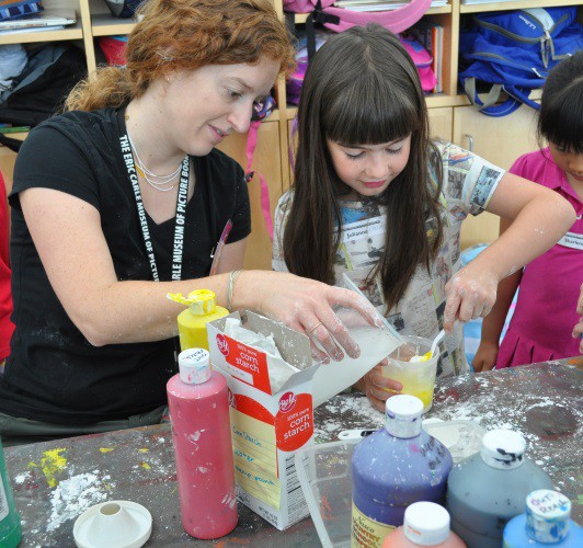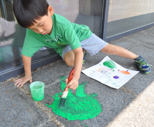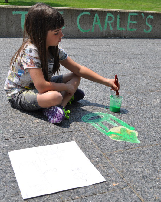 We had a lot of fun teaching our annual Animals, Art and Imagination week-long program! This year’s theme was insects and small critters, inspired by the current exhibit of Eric Carle’s work in the exhibition, The Art of Eric Carle: Bees, Butterflies, and Other Bugs. The week was packed with a series of activities and projects about bugs and animals, some lasting a few minutes, others carrying over multiple days. On the first day we made our own chalk paint and designing a playground for insects on The Art Studio’s patio. Working in two small groups, Kathryn and I helped the children to first brainstorm a list of ideas for their bug playgrounds.