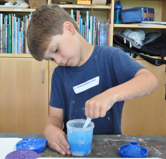 For each color you wish to make, mix equal parts corn starch and water (we used one cup of each) and mix well together in a cup with a spoon. Add one tablespoon washable tempera paint to the cup and mix until all the ingredients are combined. The mixing process is messy, so do this outside or in an area that is easy to clean, like over a sink, plastic table cloth, or tray.