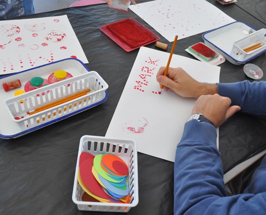 There was also a dot stamping station where all things round were pressed into red stamp pads. Turns out the eraser-end of a pencil makes great mini-dots for writing words.