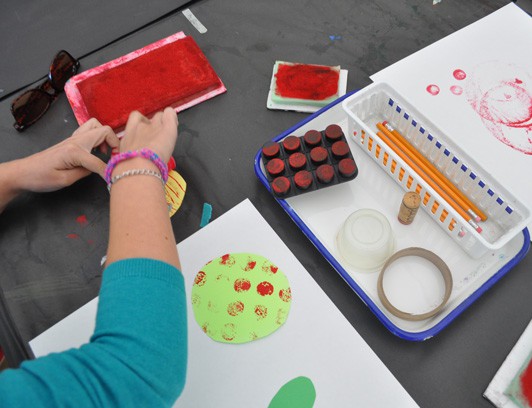 Bottle caps, corks, empty rolls of tape and apple sauce containers provided a fun variety of circles for stamping onto construction paper dots or big pieces of white paper. Notice we only put out red stamp pads so stampers didn’t get colors mixed up.