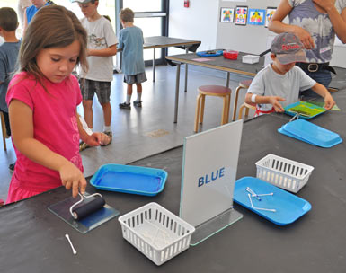 I assigned a random color order to each child to help everyone move from station to station to make an even flow around the room without crowding. When they got to their first station, everyone rolled the ink onto the small plexiglass plates in their first color, red, yellow or blue.