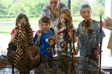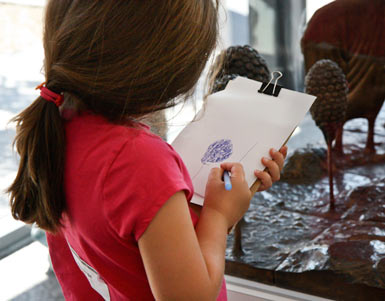Let me backtrack to earlier in the day, prior to the printmaking lesson. As a mark-making warm-up, we introduced the students (ages 6-10) to The Museum’s sculpture Imaginary Garden by Leo Lionni, which lives in the Great Hall, encased in glass.