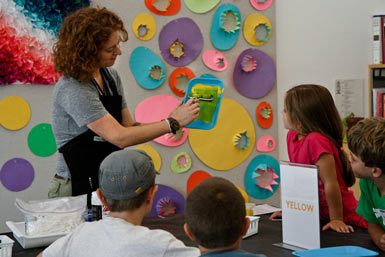 When the group returned to the Studio, I gathered them around and gave an introduction to the color wheel and how the primary colors mix together to make the secondary colors. I also demonstrated how to use the materials and tools found at each station around the room.