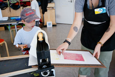 After mark-making they carried their inky plate over to the printing press station where I helped them run their plate and a piece of paper through our tabletop press. I made sure the pressure was set and handled the press blankets so they didn’t get covered in finger prints and they were in charge cranking the handle. If you don’t have a press you can just as easily hand press with pressure from rubbing your hands on the back of the paper into the inky plate.