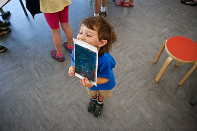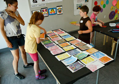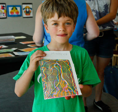 In this exercise we rolled ink on plexiglass plates in the primary colors (blue, yellow and red). When we printed the single-color plates on top of each other, a magical thing happened. In the places where those colors overlapped on the paper, the secondary colors (green, orange and purple) suddenly appeared. Okay, it’s not exactly magic, but printmaking always has a super surprise factor, you never know quite how things will turn out, and to kids especially, that’s pretty magical!