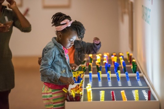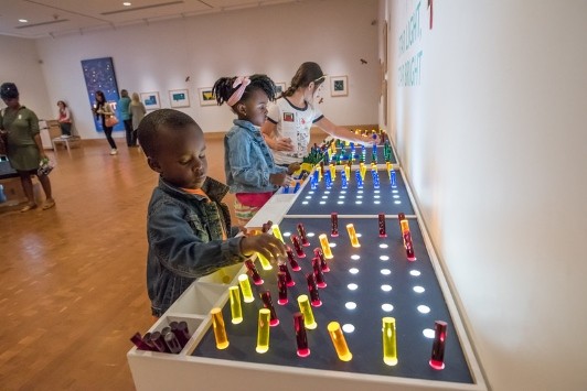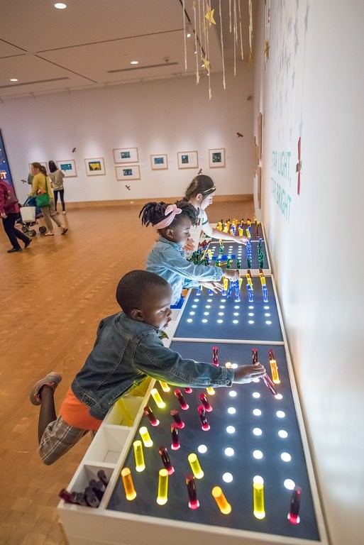 Our exhibition team created light tables with pegboard on top for guests to play with. People placed the different colored pegs in the holes, allowing light to shine through in different colors and patterns, resembling stars of the night sky.