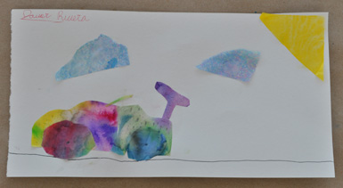 The paper we used for this project was donated to us on a giant roll from a mystery source, but you could get similar effects from coffee filter paper or pre-packaged color diffusing papers from any art supply catalog. Once this type of light-weight paper is dry, it is thin enough to be cut and glued using just liquid starch glue. Combine handmade papers with store-bought tissue papers at home to create unique collages, cards or gifts.